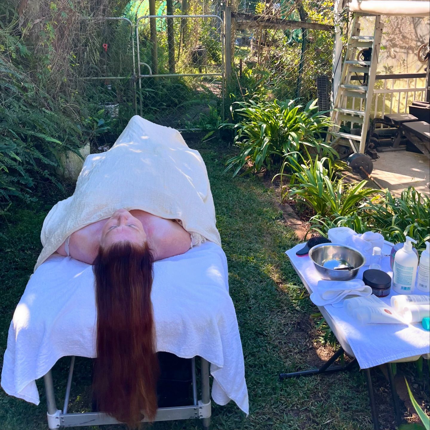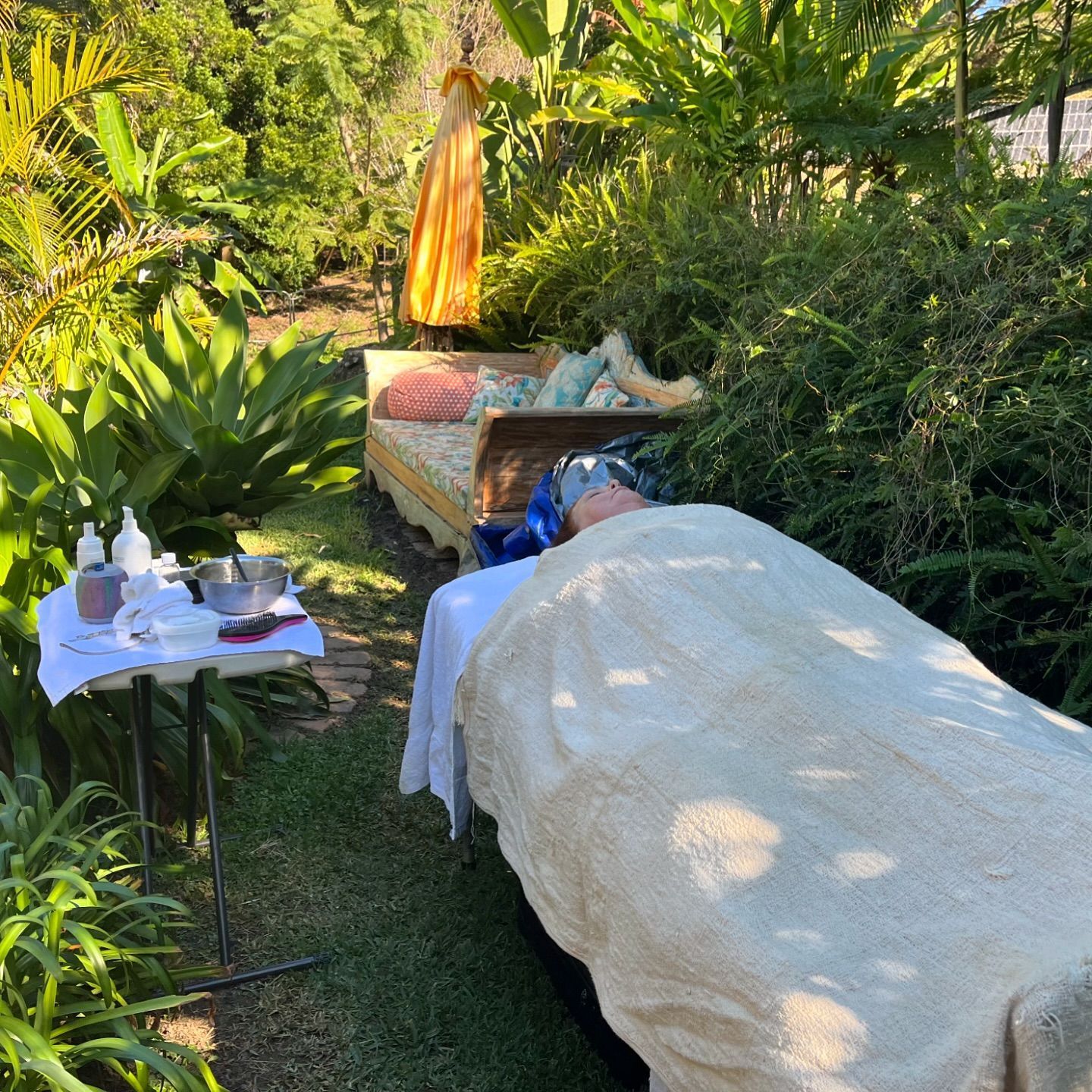 ButtonRegular client had a pamper garden set up. She did a beautiful set up outside by adding curtains. This is a VR mobile beauty setup by Virginia